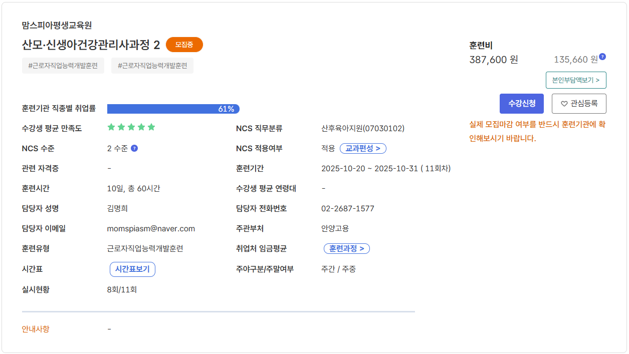 [공지] [맘스피아] 2025년 10월 20일 산모신생아건강관리사 국비지원 국민내일배움카드 HRD-Net 훈련과정 안내
