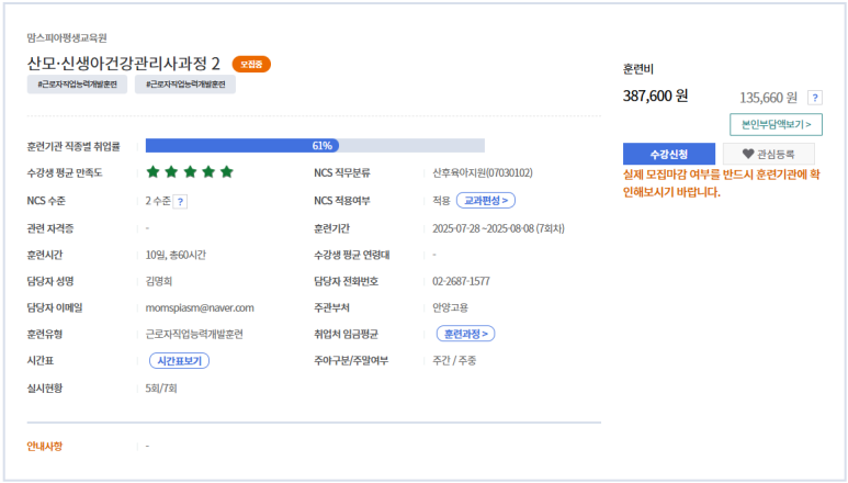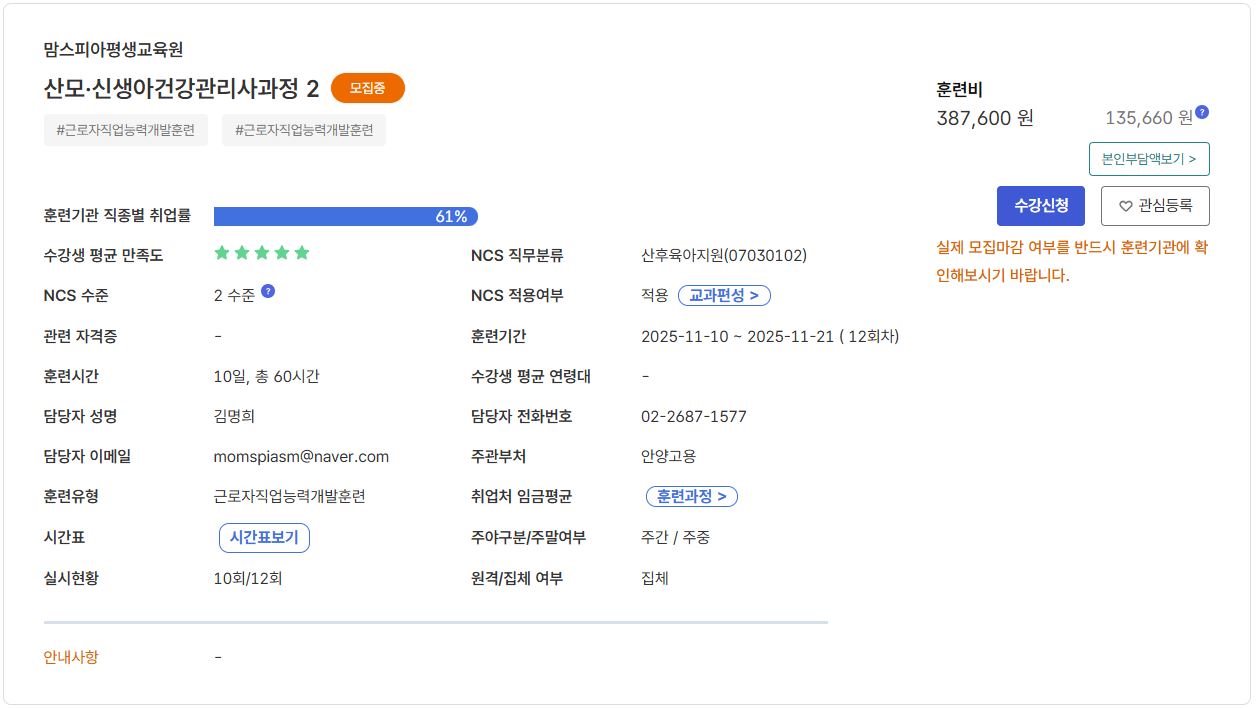 2. 훈련과정: 산모신생아 건강관리사(내일배움카드, HRD-Net 훈련)