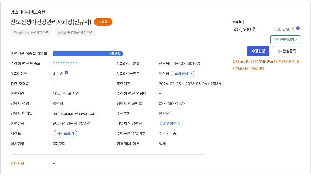 [공지] [맘스피아] 2026년2월 산모신생아건강관리사 국비지원 국민내일배움카드 HRD-Net 훈련과정 안내